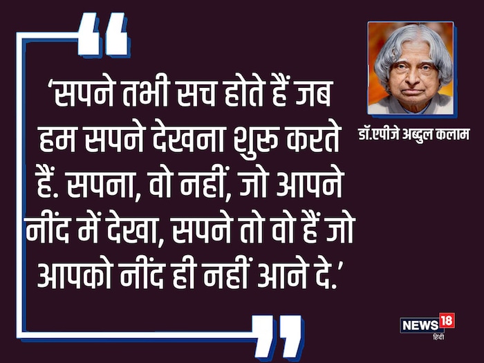 ‘सपने तभी सच होते हैं जब हम सपने देखना शुरू करते हैं. सपना, वो नहीं, जो आपने नींद में देखा, सपने तो वो हैं जो आपको नींद ही न आने दे.’ सपने के महत्व को लेकर डॉ कलाम अपने कई सेमिनारों और वक्तव्यों में विस्तार से बात बताई है. उन्होंने युवाओं को हमेशा सपने देखने के लिए प्रेरित किया है.