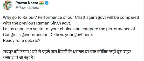 पवन खेड़ा ने सोशल मीडिया प्लेटफॉर्म एक्स (जिसे पहले ट्विटर कहा जाता था) पर एक पोस्ट में कहा, ‘रायपुर क्यों जाएं? हमारी छत्तीसगढ़ सरकार के प्रदर्शन की तुलना पिछली रमन सिंह सरकार से की जाएगी. आइए हम अपनी पसंद का एक क्षेत्र चुनें और दिल्ली में कांग्रेस सरकार बनाम अपनी सरकार के प्रदर्शन की तुलना करें. बहस के लिए तैयार हैं?’